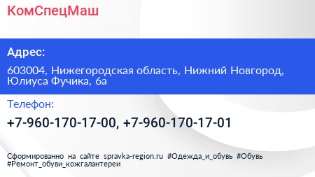 КомСпецМаш по адресу 603004, Нижегородская область, Нижний Новгород, Юлиуса Фучика, 6а в дальнейшем Организация, размещена в следующих категориях: