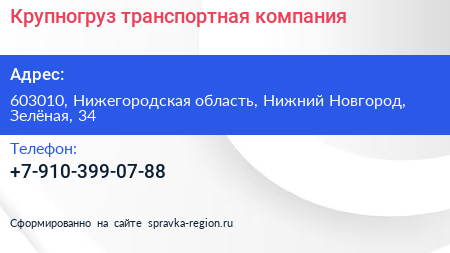 Крупногруз, транспортная компания по адресу 603010, Нижегородская область, Нижний Новгород, Зелёная, 34 в дальнейшем Организация, размещена в следующих категориях: