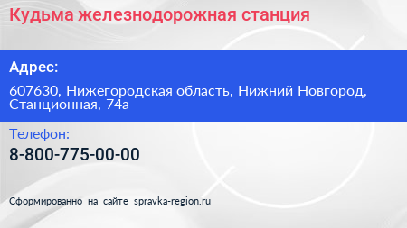 Кудьма, железнодорожная станция по адресу 607630, Нижегородская область, Нижний Новгород, Станционная, 74а в дальнейшем Организация, размещена в следующих категориях: