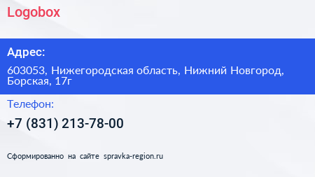 Logobox по адресу 603053, Нижегородская область, Нижний Новгород, Борская, 17г в дальнейшем Организация, размещена в следующих категориях: