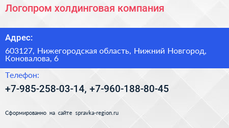 Логопром, холдинговая компания по адресу 603127, Нижегородская область, Нижний Новгород, Коновалова, 6 в дальнейшем Организация, размещена в следующих категориях: