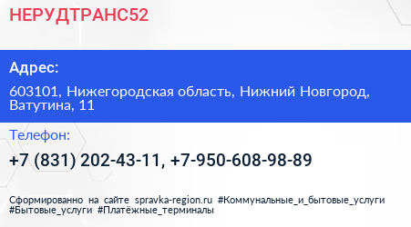 НЕРУДТРАНС52 по адресу 603101, Нижегородская область, Нижний Новгород, Ватутина, 11 в дальнейшем Организация, размещена в следующих категориях: