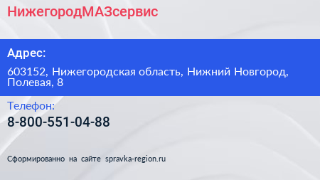 НижегородМАЗсервис по адресу 603152, Нижегородская область, Нижний Новгород, Полевая, 8 в дальнейшем Организация, размещена в следующих категориях: