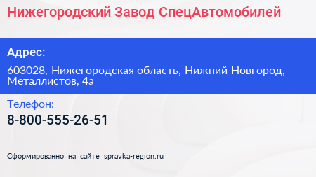 Нижегородский Завод СпецАвтомобилей по адресу 603028, Нижегородская область, Нижний Новгород, Металлистов, 4а в дальнейшем Организация, размещена в следующих категориях: