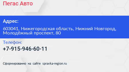 Пегас-Авто по адресу 603041, Нижегородская область, Нижний Новгород, Молодёжный проспект, 80 в дальнейшем Организация, размещена в следующих категориях: