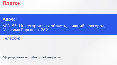 Платон по адресу 603155, Нижегородская область, Нижний Новгород, Максима Горького, 262 в дальнейшем Организация, размещена в следующих категориях:
