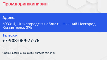 Промдоринжиниринг по адресу 603014, Нижегородская область, Нижний Новгород, Коминтерна, 39Б в дальнейшем Организация, размещена в следующих категориях: