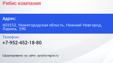 Рибис, компания по адресу 603152, Нижегородская область, Нижний Новгород, Ларина, 19Б в дальнейшем Организация, размещена в следующих категориях: