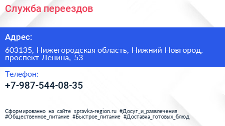 Служба переездов по адресу 603135, Нижегородская область, Нижний Новгород, проспект Ленина, 53 в дальнейшем Организация, размещена в следующих категориях: