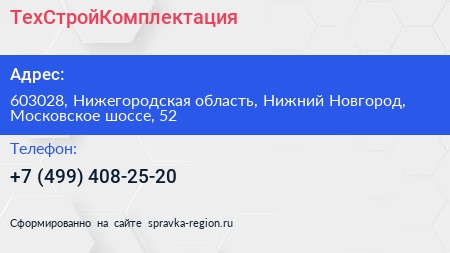 ТехСтройКомплектация по адресу 603028, Нижегородская область, Нижний Новгород, Московское шоссе, 52 в дальнейшем Организация, размещена в следующих категориях:
