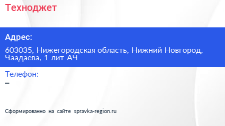 Техноджет по адресу 603035, Нижегородская область, Нижний Новгород, Чаадаева, 1 лит АЧ в дальнейшем Организация, размещена в следующих категориях: