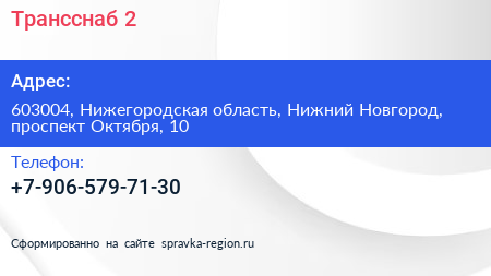 Трансснаб-2 по адресу 603004, Нижегородская область, Нижний Новгород, проспект Октября, 10 в дальнейшем Организация, размещена в следующих категориях:
