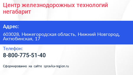 Центр железнодорожных технологий негабарит по адресу 603028, Нижегородская область, Нижний Новгород, Актюбинская, 17 в дальнейшем Организация, размещена в следующих категориях: