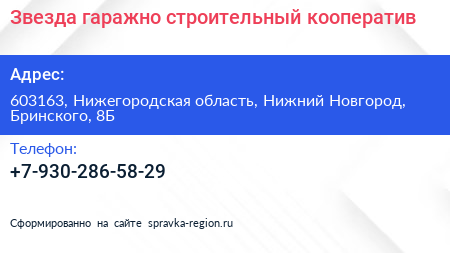 Звезда, гаражно-строительный кооператив по адресу 603163, Нижегородская область, Нижний Новгород, Бринского, 8Б в дальнейшем Организация, размещена в следующих категориях:
