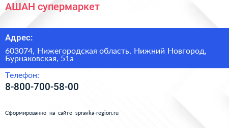 АШАН, супермаркет по адресу 603074, Нижегородская область, Нижний Новгород, Бурнаковская, 51а в дальнейшем Организация, размещена в следующих категориях: