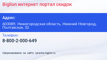 Biglion, интернет-портал скидок по адресу 603089, Нижегородская область, Нижний Новгород, Полтавская, 32 в дальнейшем Организация, размещена в следующих категориях: