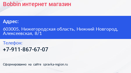 Bobbin, интернет-магазин по адресу 603005, Нижегородская область, Нижний Новгород, Алексеевская, 8/1 в дальнейшем Организация, размещена в следующих категориях: