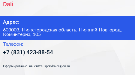Dali по адресу 603003, Нижегородская область, Нижний Новгород, Коминтерна, 105 в дальнейшем Организация, размещена в следующих категориях: