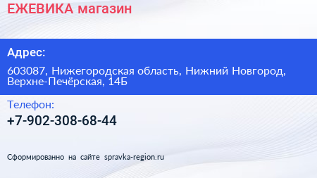 ЕЖЕВИКА, магазин по адресу 603087, Нижегородская область, Нижний Новгород, Верхне-Печёрская, 14Б в дальнейшем Организация, размещена в следующих категориях: