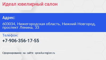 Идеал, ювелирный салон по адресу 603034, Нижегородская область, Нижний Новгород, проспект Ленина, 33 в дальнейшем Организация, размещена в следующих категориях: