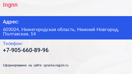 Ingnn по адресу 603024, Нижегородская область, Нижний Новгород, Полтавская, 14 в дальнейшем Организация, размещена в следующих категориях: