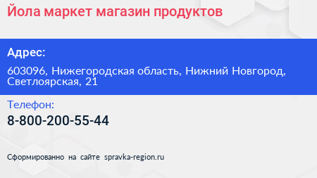 Йола-маркет, магазин продуктов по адресу 603096, Нижегородская область, Нижний Новгород, Светлоярская, 21 в дальнейшем Организация, размещена в следующих категориях: