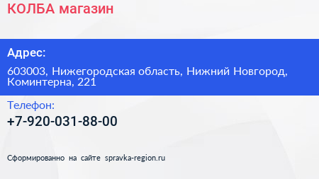 КОЛБА, магазин по адресу 603003, Нижегородская область, Нижний Новгород, Коминтерна, 221 в дальнейшем Организация, размещена в следующих категориях: