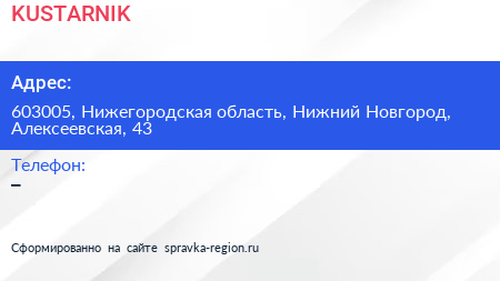 KUSTARNIK по адресу 603005, Нижегородская область, Нижний Новгород, Алексеевская, 43 в дальнейшем Организация, размещена в следующих категориях: