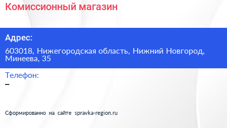 Комиссионный магазин по адресу 603018, Нижегородская область, Нижний Новгород, Минеева, 35 в дальнейшем Организация, размещена в следующих категориях: