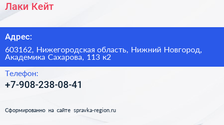 Лаки Кейт по адресу 603162, Нижегородская область, Нижний Новгород, Академика Сахарова, 113 к2 в дальнейшем Организация, размещена в следующих категориях: