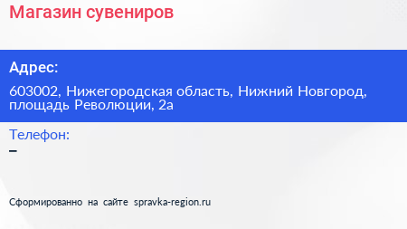 Магазин сувениров по адресу 603002, Нижегородская область, Нижний Новгород, площадь Революции, 2а в дальнейшем Организация, размещена в следующих категориях:
