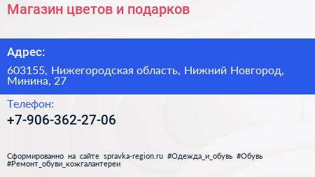 Магазин цветов и подарков по адресу 603155, Нижегородская область, Нижний Новгород, Минина, 27 в дальнейшем Организация, размещена в следующих категориях: