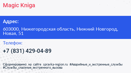 Magic-Kniga по адресу 603000, Нижегородская область, Нижний Новгород, Новая, 51 в дальнейшем Организация, размещена в следующих категориях: