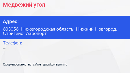 Медвежий угол по адресу 603056, Нижегородская область, Нижний Новгород, Стригино, Аэропорт в дальнейшем Организация, размещена в следующих категориях: