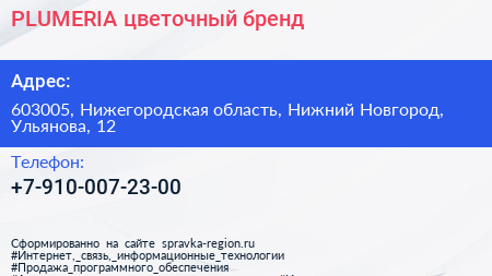 PLUMERIA, цветочный бренд по адресу 603005, Нижегородская область, Нижний Новгород, Ульянова, 12 в дальнейшем Организация, размещена в следующих категориях: