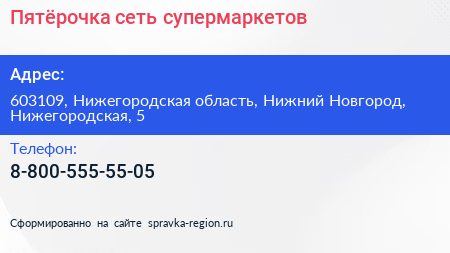 Пятёрочка, сеть супермаркетов по адресу 603109, Нижегородская область, Нижний Новгород, Нижегородская, 5 в дальнейшем Организация, размещена в следующих категориях: