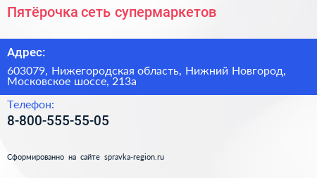 Пятёрочка, сеть супермаркетов по адресу 603079, Нижегородская область, Нижний Новгород, Московское шоссе, 213а в дальнейшем Организация, размещена в следующих категориях: