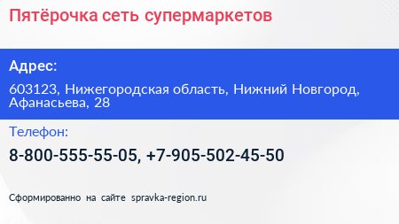 Пятёрочка, сеть супермаркетов по адресу 603123, Нижегородская область, Нижний Новгород, Афанасьева, 28 в дальнейшем Организация, размещена в следующих категориях: