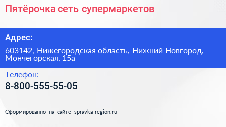 Пятёрочка, сеть супермаркетов по адресу 603142, Нижегородская область, Нижний Новгород, Мончегорская, 15а в дальнейшем Организация, размещена в следующих категориях: