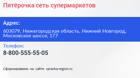 Пятёрочка, сеть супермаркетов по адресу 603079, Нижегородская область, Нижний Новгород, Московское шоссе, 177 в дальнейшем Организация, размещена в следующих категориях: