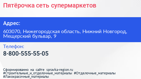 Пятёрочка, сеть супермаркетов по адресу 603070, Нижегородская область, Нижний Новгород, Мещерский бульвар, 9 в дальнейшем Организация, размещена в следующих категориях:
