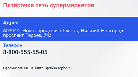 Пятёрочка, сеть супермаркетов по адресу 603044, Нижегородская область, Нижний Новгород, проспект Героев, 74а в дальнейшем Организация, размещена в следующих категориях: