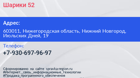 Шарики 52 по адресу 603011, Нижегородская область, Нижний Новгород, Июльских Дней, 19 в дальнейшем Организация, размещена в следующих категориях: