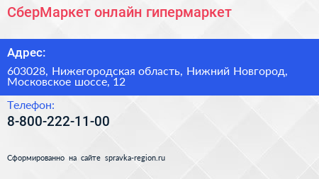 СберМаркет, онлайн-гипермаркет по адресу 603028, Нижегородская область, Нижний Новгород, Московское шоссе, 12 в дальнейшем Организация, размещена в следующих категориях: