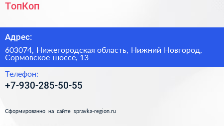 ТопКоп по адресу 603074, Нижегородская область, Нижний Новгород, Сормовское шоссе, 13 в дальнейшем Организация, размещена в следующих категориях: