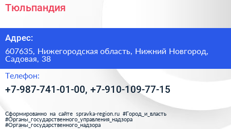 Тюльпандия по адресу 607635, Нижегородская область, Нижний Новгород, Садовая, 38 в дальнейшем Организация, размещена в следующих категориях: