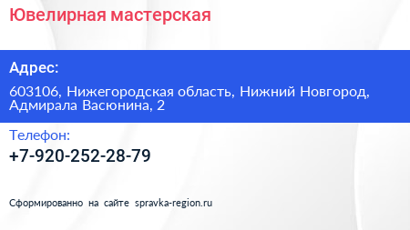 Ювелирная мастерская по адресу 603106, Нижегородская область, Нижний Новгород, Адмирала Васюнина, 2 в дальнейшем Организация, размещена в следующих категориях: