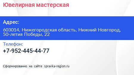 Ювелирная мастерская по адресу 603014, Нижегородская область, Нижний Новгород, 50-летия Победы, 22 в дальнейшем Организация, размещена в следующих категориях: