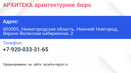 АРХИТЕКА, архитектурное бюро по адресу 603005, Нижегородская область, Нижний Новгород, Верхне-Волжская набережная, 2 в дальнейшем Организация, размещена в следующих категориях: