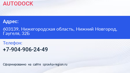 AUTODOCK по адресу 603139, Нижегородская область, Нижний Новгород, Гаугеля, 32Б в дальнейшем Организация, размещена в следующих категориях: